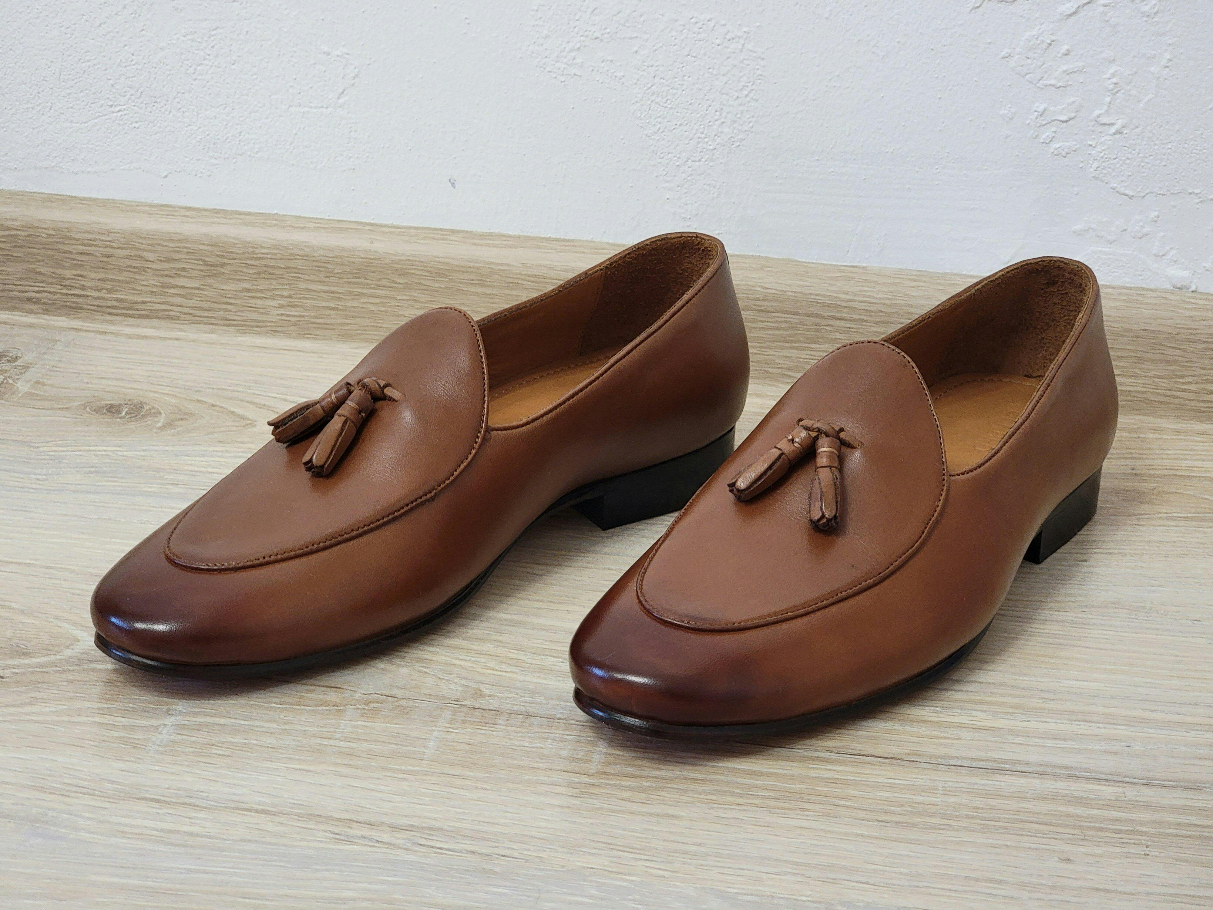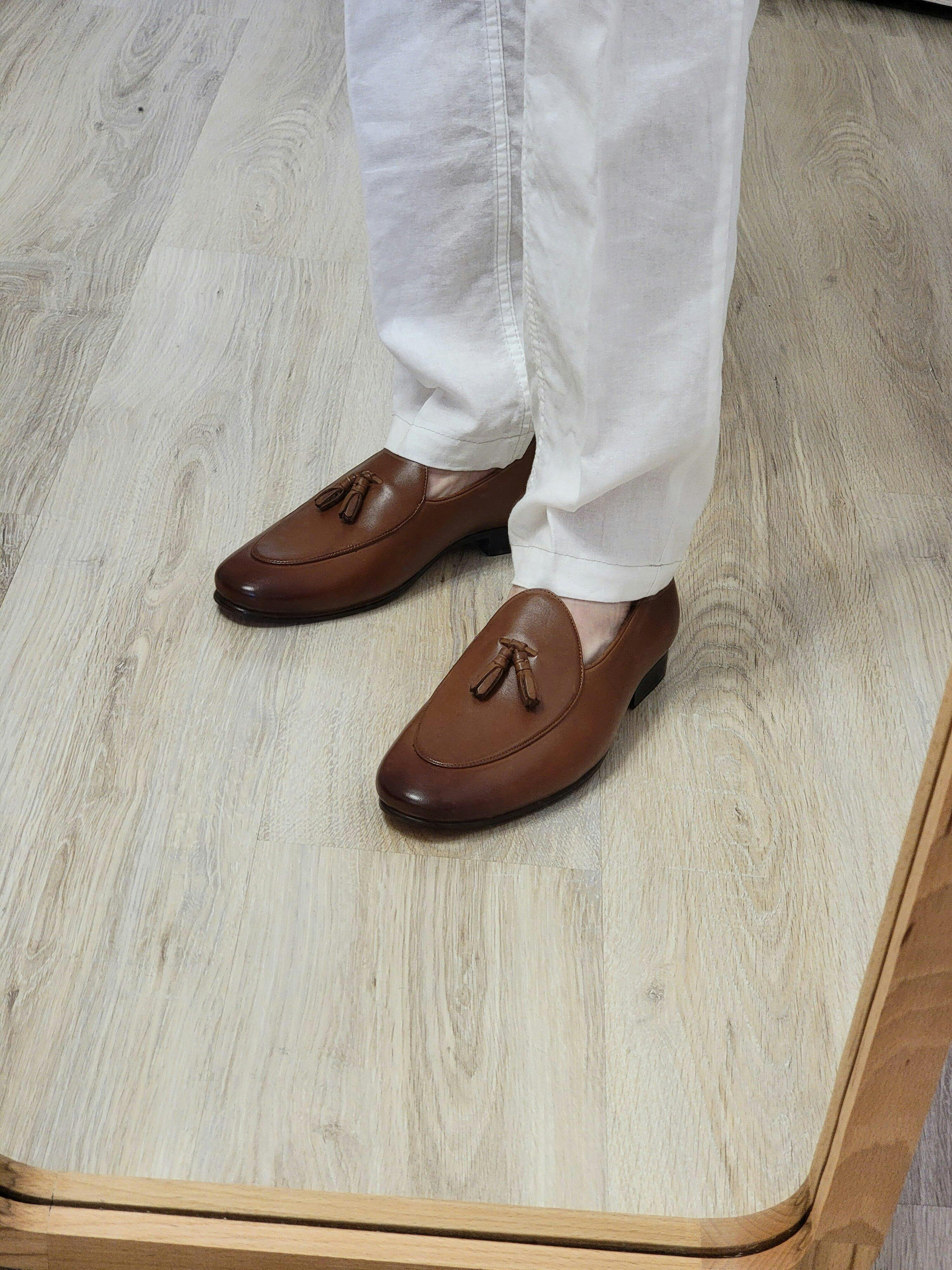 René is an English Tassel Loafer reinvented in a sleeker profile with Belgian style apron on the vamp. Owing to its sleek proportions, the René is perfect choice for the young dapper men who like to pair their shoes with modern dress styles. These tassel loafers can be paired with smart chinos, jeans and any tapering trousers in general.